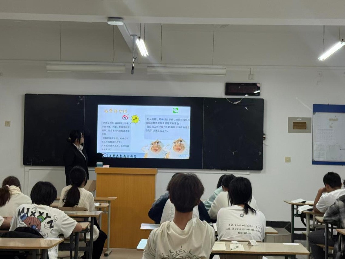活动现场,新媒体中心成员以“视频+PPT”为核心载体,生动诠释新媒体的魅力与意义。通过PPT清晰拆解文编部、运营部和媒体部三大核心职能:文编部撰写审核新闻稿与原创内容,用文字记录学术活动与文体赛事;媒体部以镜头为笔,负责摄影摄像及后期筛选,定格师生成长与校园美景;运营部专注微信公众号平台运营,借精美排版与短视频策划,让学院动态及时触达师生。同时,成员结合所讲解答新生关于部门职能、工作时间、技能提升的疑问,中心成员生动介绍新媒体工作的魅力与意义。