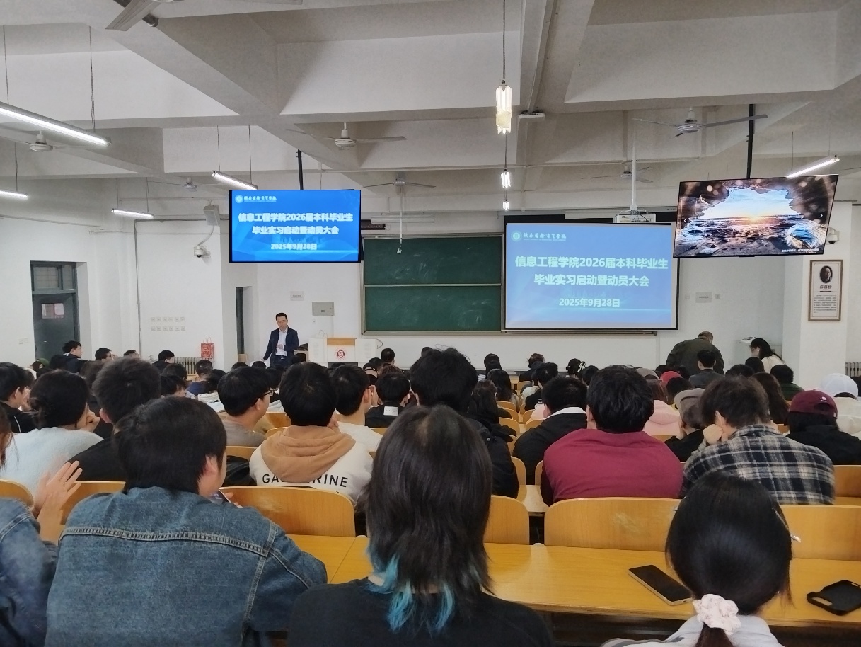 2025 年 9 月 28 日下午,信息工程学院在 2 - 227 教室召开了2026届本科毕业生毕业实习启动暨动员大会。大会旨在为即将步入实习岗位的毕业生们明确实习目标、规范实习流程,助力学生开启职业生涯的新篇章。学院院长王希娟、党总支书记王彪、副院长程卫平、教务处实践教学中心负责老师、信工学院学工办全体成员、毕业实习指导老师代表以及2026届220名学生代表参加了此次大会,会议由程卫平副院长主持。