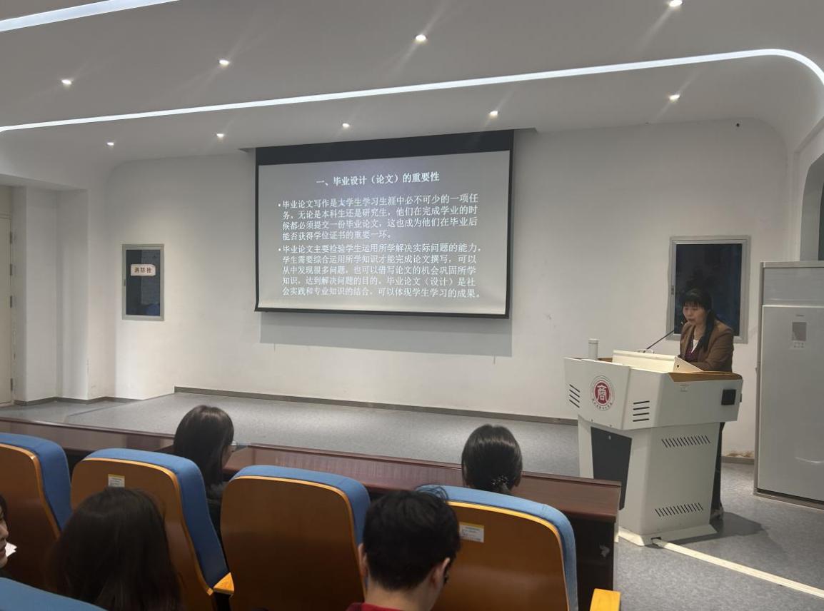 会议期间,段老师从论文选题、导师分配、开题报告撰写、中期检查、论文撰写与修改、以及最终答辩等环节对毕业论文(设计)工作规范要求进行了系统介绍。她强调,学生应主动与指导教师保持经常性定期沟通,遵守学术规范,杜绝抄袭等学术不端行为,确保论文的原创性与学术质量。