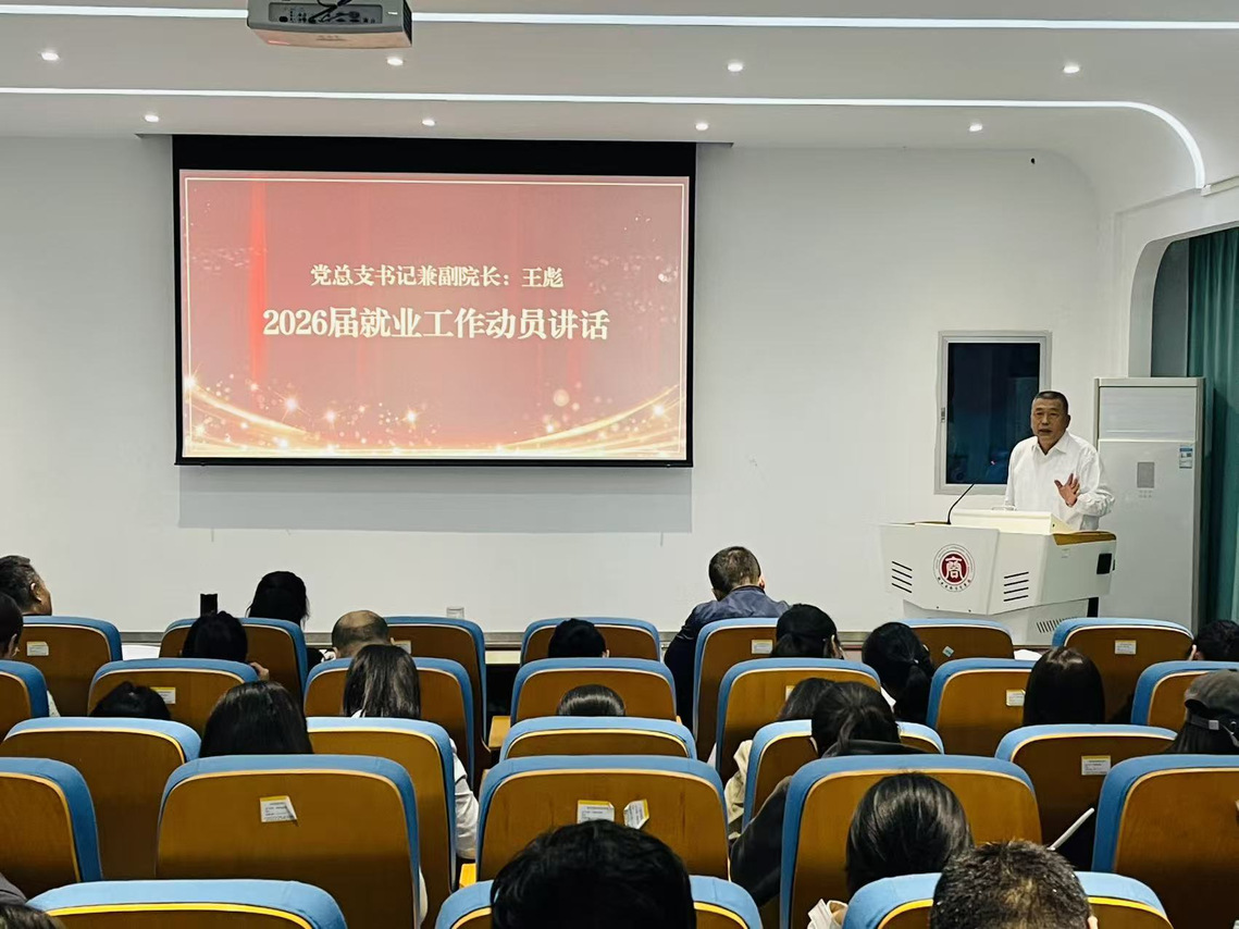 王彪书记作2026届就业工作动员讲话。他结合2026届毕业生就业意向调查问卷结果进行分析:数据显示,62%的学生选择在生源地就业,21%倾向新一线城市,仅不到10%计划前往北上广深;职业选择上,事业单位和国有企业成为主流意向。他强调,当前学生存在“自我认识不清”“职业期待与现实脱节”等问题,亟需教师加强引导。他要求全体教师提高政治站位,统一思想行动,从“心理疏导、观念转变、技能提升”三方面入手,帮助学生树立积极就业观;同时要主动对接新形势,创新工作方法,通过高频次举办招聘会、深化访企拓岗等举措,拓宽就业渠道。