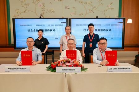 2025年9月12日,陕西国际商贸学院与华为云计算技术有限公司、上谷(陕西)信息技术有限公司(以下简称‘华为云’‘上谷’)在华为上海练秋湖研发中心举行校企合作签约仪式,携手开启产教融合、协同育人的新篇章。学校执行校长贾明远,副校长张富林,华为云、上谷主要负责人以及双方相关部门、单位负责人出席签约仪式。
