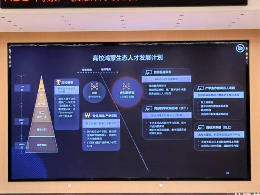 会议对鸿蒙的发展做了详细介绍,并提出了“高校鸿蒙生态人才发展计划”,采用“学生导向+老师导向”双轨模式:学生侧依托高校赛事、专业共建及产业学院,打通课堂、赛场与企业场景,实现学做合一、以赛促学;教师侧依托智能基座、鸿蒙教学发展活动、产业合作协同育人项目和“百校未来星”平台,为教师提供教材、设备与案例资源,助力鸿蒙教学内容无缝融入课程体系。双重驱动旨在让师生共同动手,共建鸿蒙生态人才体系,不断充实国产操作系统的人才池。